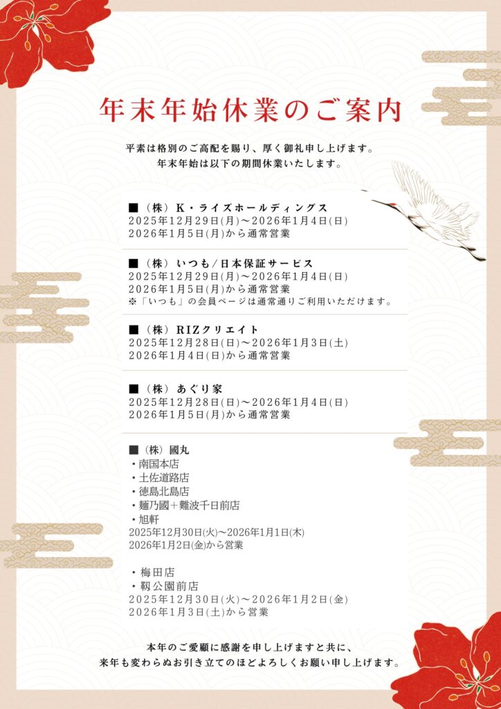 年末年始の営業に関するご案内 投稿日 2025.12.24 カテゴリー お知らせ 平素は格別のご高配を賜り、厚く御礼申し上げます。 誠に勝手ながら、年末年始の休業期間を以下のとおりとさせていただきます。ご不便をおかけいたしますが、何卒ご了承いただきますようお願い申し上げます。 本年のご愛顧に感謝を申し上げますと共に来年も変わらぬお引き立てのほど、よろしくお願い申し上げます。